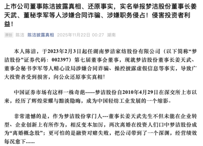 一边,是上市公司湖南梦洁家纺股份有限公司(下称“梦洁股份”)董事陈洁,通过个人社交平台,以“请君入瓮”“趁火打劫”“欺上瞒下”“赶尽杀绝”“偷天换日”等凌厉字眼,实名举报公司董事长姜天武及董秘李军涉嫌合同诈骗、职务侵占等多项严重问题。