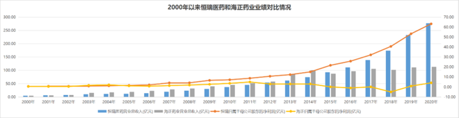 当时,海正药业常常被与恒瑞医药相提并论——两家公司同年上市,规模相当。2000年,海正药业营收5.18亿元,净利润5100万元;恒瑞医药同期收入4.85亿元,净利润6527万元。在上市之初的几年里,两家企业并肩前行,海正药业甚至略占上风。