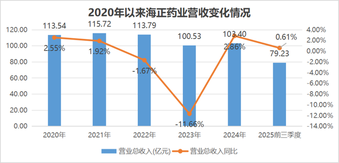 2025年前三季度,海正药业营收为79.23亿元,同比微增0.61%,虽然终结了自2022年以来的连续下滑态势,但归母净利润仅为4.61亿元,同比下滑10.55%。