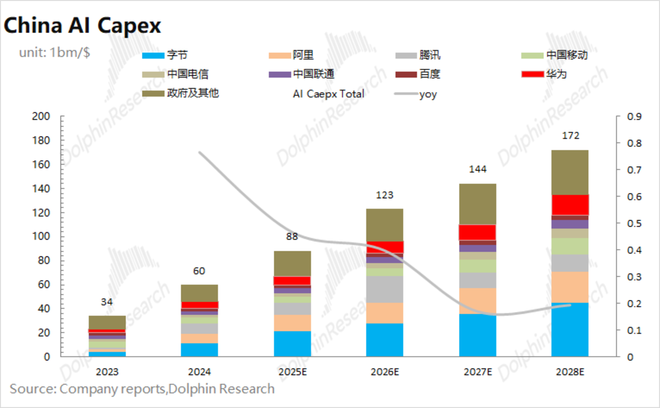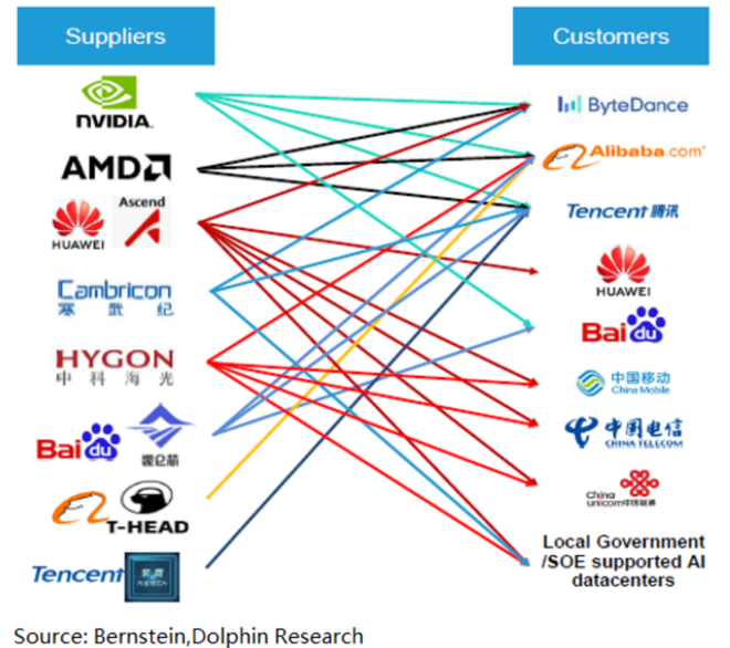 首先,海豚君将中国需要AI芯片卡的直接客户分为三类:互联网大厂(字节、腾讯、阿里、百度)、华为云、运营商及政企云(中国移动、中国联通、中国电信等)。