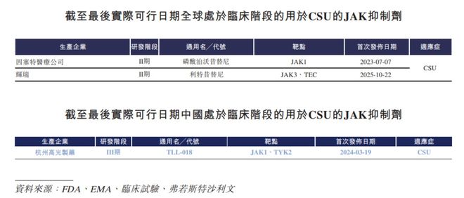 不过,在一些特定疾病领域,高光制药仍有树立差异化优势的空间。比如CSU。据了解,全球尚无JAK抑制剂获批用于治疗CSU,仅有三款用于治疗CSU的JAK抑制剂处于临床开发阶段,即因塞特医疗公司的磷酸泊沃昔替尼、辉瑞的利特昔替尼以及高光制药的TLL-018。