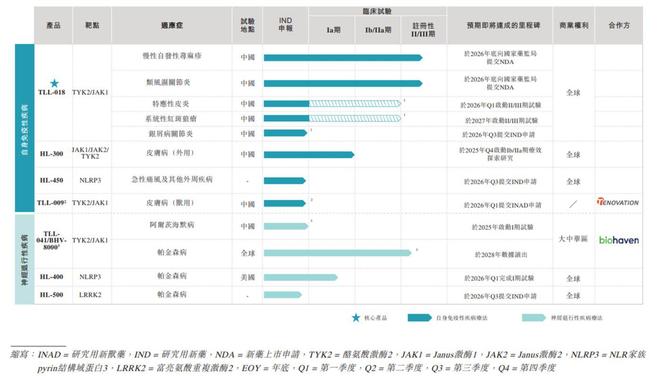 自身免疫性疾病管线中,核心产品TLL-018是全球唯一具有高选择性的TYK2/JAK1抑制剂。基于“一药多适应症”的开发策略,TLL-018旨在治疗慢性自发性荨麻疹(CSU)、类风湿关节炎(RA)、特应性皮炎(AD)、银屑病关节炎(PsA)和系统性红斑狼疮(SLE)在内的多种自身免疫性疾病。