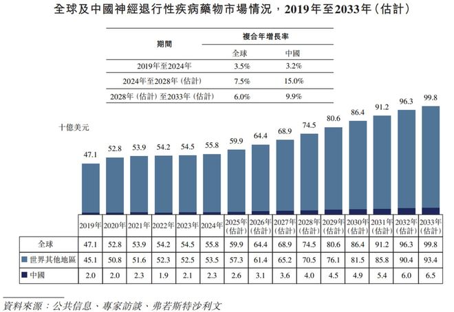 另外,2019-2024年,全球神经退行性疾病药物市场规模从471亿美元增至558亿美元;预计到2028年将达到745亿美元,到2033年将达到998亿美元。