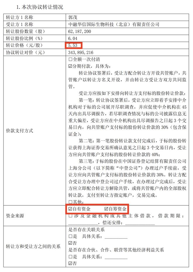 减持(10月29-11月28日)刚结束仅十天,郭茂便紧接着筹划这次协议转让:12月8日,郭茂与中融华信签订股份转让协议,中融华信拟3.43亿受让郭茂6.04%股份,并承诺过户后12个月内不减持。![]()