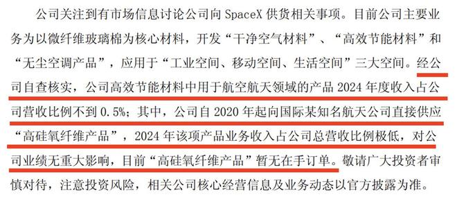 不过,在再升科技昨日的风险提示中,对该传闻作出澄清。经公司自查核实,高效节能材料中用于航空航天领域的产品2024年度收入占公司营收比例不到0.5%。此外,公司自2020年起向国际某知名航天公司直接供应“高硅氧纤维产品”,2024年该项产品业务收入占公司总营收比例极低,且目前“高硅氧纤维产品”暂无在手订单。