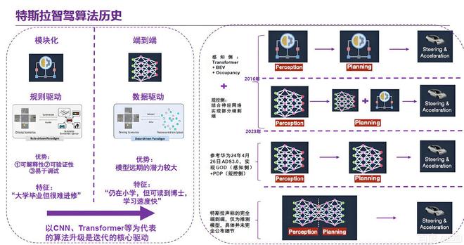 2022-2023年,以特斯拉FSD V12为代表的“端到端”模型横空出世,彻底颠覆了传统架构范式。这一方案的灵感源于人类驾驶学习逻辑:新手司机不会先钻研光学原理与交通规则,而是通过观察教练操作直接习得驾驶技能。