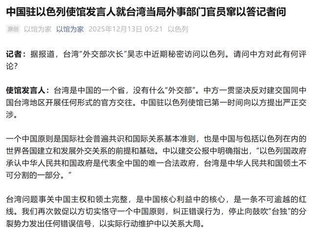 据中华人民共和国驻以色列大使馆领事部官微“以馆为家”12月13日消息,中国驻以色列使馆发言人就台湾当局外事部门官员窜以答记者问。