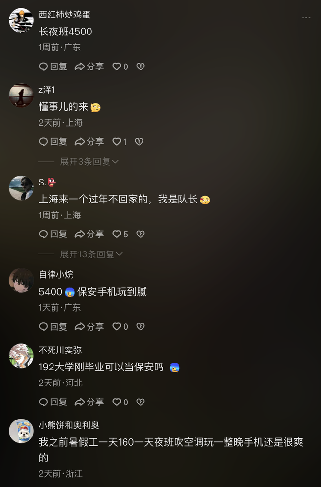 这类视频也给人们一种感觉:保安这个工作清闲又稳定,能从18岁一直干到80岁。因此无论是在弹幕还是评论区,你都能看到人们在到处自荐,渴望有一天自己也能成为保安。