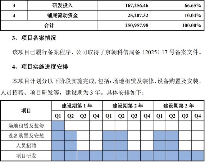 这与招股书披露的资金规划一致,除10亿用来补充流动资金外,摩尔线程剩余近70亿募集资金将用来投资“摩尔线程新一代自主可控AI训推一体芯片研发项目”“摩尔线程新一代自主可控图形芯片研发项目”“摩尔线程新一代自主可控AISoC芯片研发项目”。这三个项目的建设周期均为三年,其中“研发投入”是所有项目的核心投入项,根据各项目的研发进度规划,将在三年内持续投放。