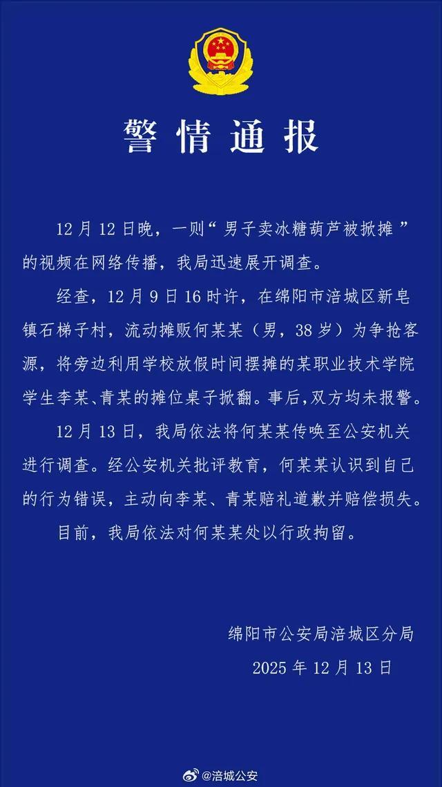 四川绵阳两名大学生摆摊卖冰糖葫芦时遭遇隔壁摊贩掀桌事件,警方已介入处理,据警方通报,涉事流动摊贩何某某,男,38岁,因涉嫌扰乱公共秩序被行政拘留,事件引起社会关注,提醒各方在摆摊经营时需遵守公共秩序,共同维护良好的市场环境。