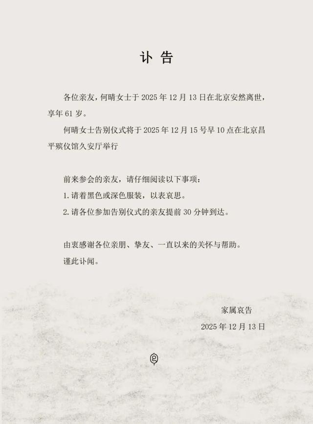据扬子晚报消息,12月13日,一份家属发布讣告显示,著名演员何晴在北京安然离世,享年61岁。告别仪式将于2025年12月15号早10点在北京昌平殡仪馆久安厅举行。