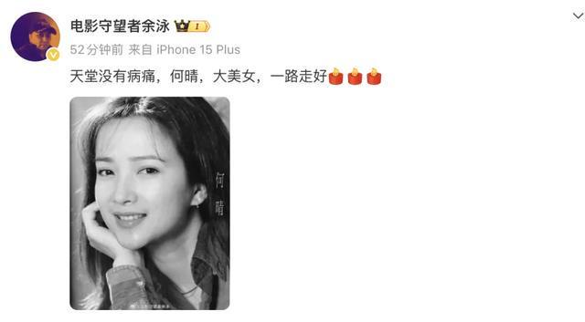 “电影守望者余泳”向记者证实了这一消息,他于社交平台发布何晴的黑白肖像照,并配文“天堂没有病痛,何晴,大美女,一路走好”,引发网友与演艺圈人士的集体缅怀。余泳透露,何晴生病后一直希望低调,让大家永远记住她美好的形象。