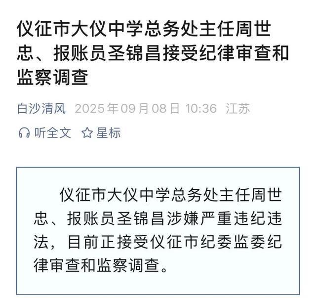 仪征市大仪中学总务处主任周世忠、报账员圣锦昌涉嫌严重违纪违法,目前正接受仪征市纪委监委纪律审查和监察调查。