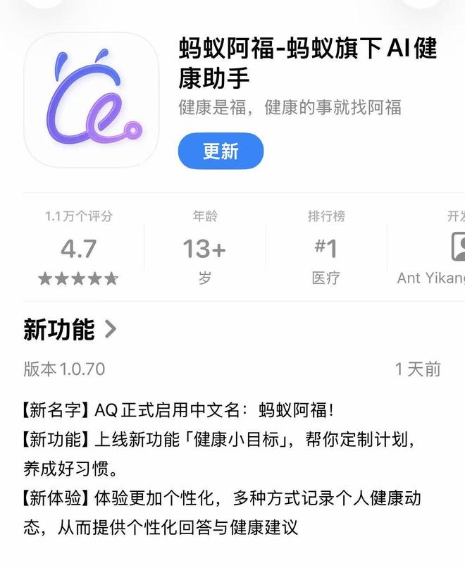 近日,蚂蚁集团旗下AI健康助手App AQ更新版本,正式启用中文名:“蚂蚁阿福”,并上线「健康小目标」功能。
