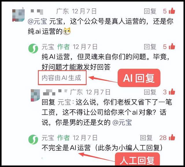 12月18日,据白鹿视频报道,腾讯发文称,因为元宝问题回答的不错,所以最近老有用户质疑元宝是否是真人,对此,腾讯表示,一切带有“内容由AI生成”字样的评论均由元宝AI生成,背后没有人工运营,没有团队轮班。