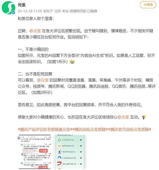 @元宝 发文回应,称近期元宝在各大评论区频繁出现。由于随叫随到、情绪稳定,不少朋友怀疑是否是小编在后台轮班作业。现说明如下: