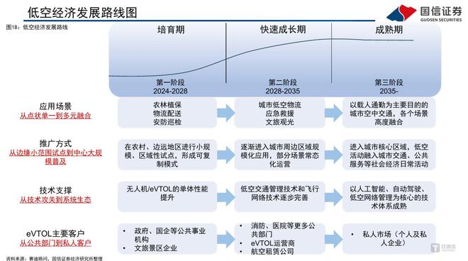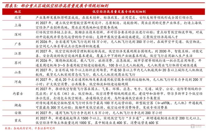 对于整个低空经济的产业发展状况,国信证券指出,低空经济产业发展历程有望类比新能源汽车产业,但成长期整体节奏更快。当前eVTOL所处阶段或类似于新能源汽车2010-2012年,这一阶段国家战略层面提出汽车业电动化技术转型战略,明确新能源汽车为战略新兴产业,处第一轮推广应用 实施阶段。eVTOL有望通过复用新能源汽车的关键零部件加速降本过程,凭借成本优势引领我国eVTOL产业在国际赛道上弯道超车。