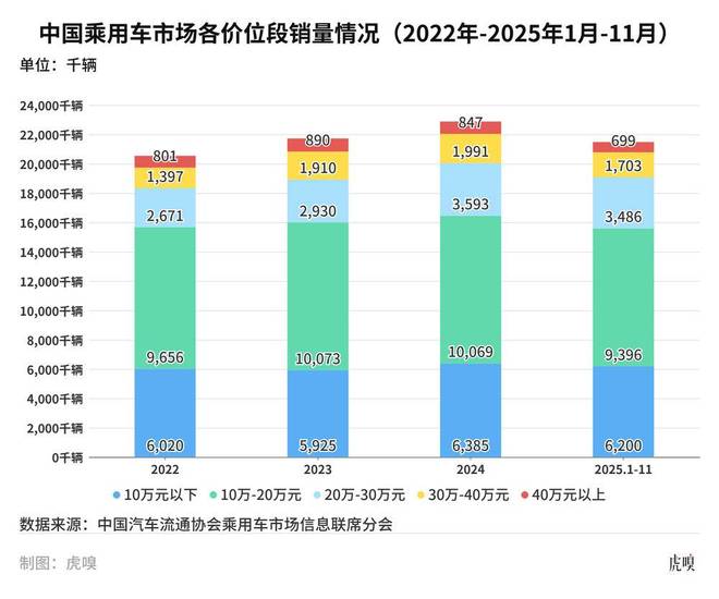 根据中国汽车流通协会乘用车市场信息联席分会(下称乘联分会)的数据,2025年前11个月,豪华品牌销量同比下降10.6%,其中40万以上车型下降8.2%,30万—40万区间下降4.0%。最令人心惊的是,曾经被视为“利润奶牛”的30万—40万级轿车市场成为下滑最大的细分品类,跌幅高达14.4%。