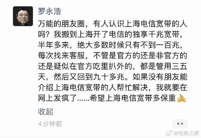 近日,罗永浩在朋友圈吐槽上海电信宽带,称独享千兆宽带实际不到百兆,并放话再得不到解决将“在网上发疯”: