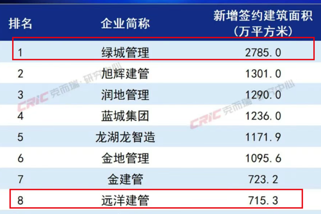 但放在行业中来看,远洋集团的优势并不突出。克而瑞数据显示,今年前三季度,“代建第一股”绿城管理以2785万平方米的新增签约建筑面积,在行业中遥遥领先。同期,远洋建管的新增签约建筑面积为715.3万平方米,约合绿城管理的1/4,位列行业第8。
