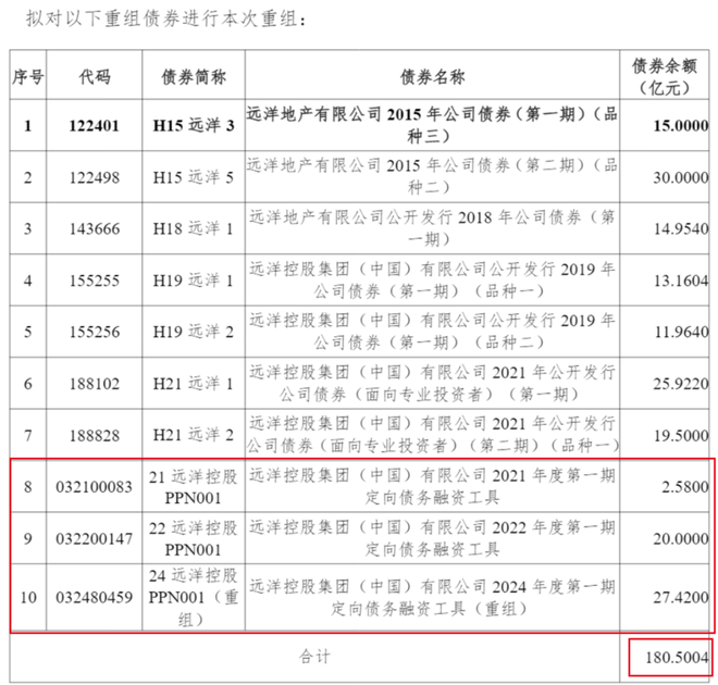 今年8月,远洋控股宣布,经远洋集团协调,拟对公司的10只境内债进行重组,合计金额约180.5亿元。据悉,远洋控股是远洋集团在境内最主要的业务经营实体和发债主体。