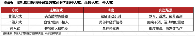 输入式则依靠接收外部刺激并将其转化为大脑内部的感知或认知,以增强或恢复用户的感官体验,通常用于恢复受损的感觉能力;双向交互式则结合了输出式和输入式的功能,进一步提高用户体验和控制精度。根据信号采集方式和技术,可分为侵入式、半侵入式、非侵入式。