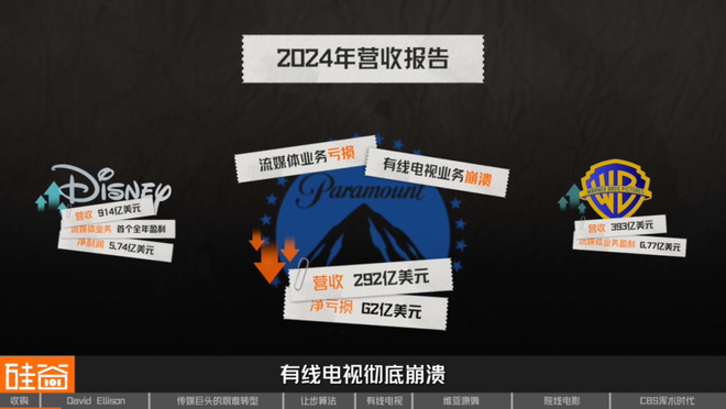 2024年,迪士尼营收914亿美元,流媒体业务实现了首个全年盈利,净利润达到5.74亿美元;华纳兄弟探索营收393亿美元,流媒体盈利6.77亿美元。相比之下,派拉蒙2024年营收仅292亿美元,净亏损62亿美元,流媒体还在亏损,有线电视彻底崩溃,昔日制片厂巨头威风不再。