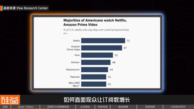 小华 媒体高管,《美轮美换》主播 因为现在大家公认的是,这场流媒体战争最后可能只能有四到五个玩家能够最后活下来并且实现盈利。现在毫无疑问Netflix已经是一个最大的赢家了。那除此之外的话像Amazon和Apple TV,因为它们完全不需要考虑盈利的问题,所以说也很有可能能够幸存下来。然后Disney因为也建立起了自己的一个小小的bundle(组合订阅),就包含了Disney+,hulu,以及这个新推出的体育的流媒体ESPN+,也很有可能幸存。那剩下来的一到两张船票,竞争者就是包括Paramount+、HBO Max以及Peacock。所以现在David Ellison就迫不及待需要通过这个收购,然后能够争取到最后一张船票。