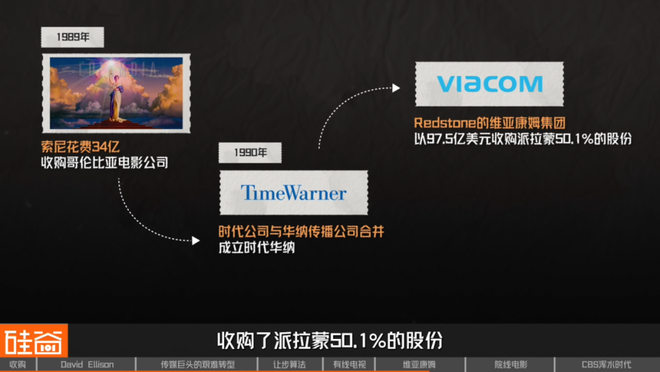 1989年,索尼以34亿收购哥伦比亚电影公司,1990年,时代公司与华纳传播公司合并,成立时代华纳。很快,Redstone的维亚康姆集团以97.5亿美元收购了派拉蒙50.1%的股份,经过与购物频道QVC五个月的竞购战后完成合并。Redstone成为派拉蒙的新主人。