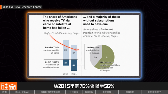 根据皮尤研究中心2021年的调查,通过有线或卫星观看电视的美国人比例从2015年的76%骤降至56%。