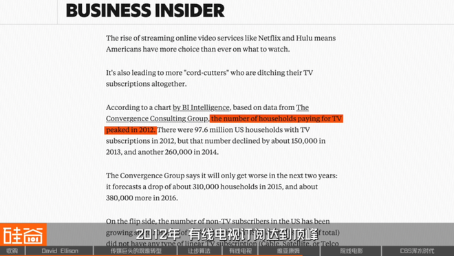2012年,有线电视订阅达到顶峰。2013年,做录像带租赁生意起家的网飞进军原创内容,推出风靡一时的《纸牌屋》,自此有线电视用户连年流失,利润缓慢下滑。