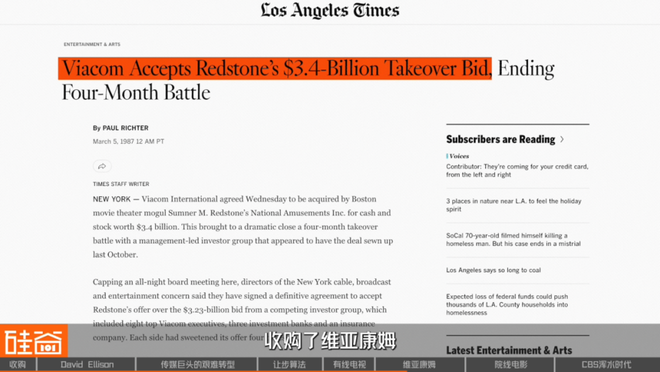 1999年,Redstone的维亚康姆收购了CBS集团,创造了一个440亿美元的广播、电视和电影巨头,与时代华纳和迪士尼等集团竞争。雷石东2005年为了提振股价将CBS又从维纳康姆分拆出去,2019年两家公司再次合并。