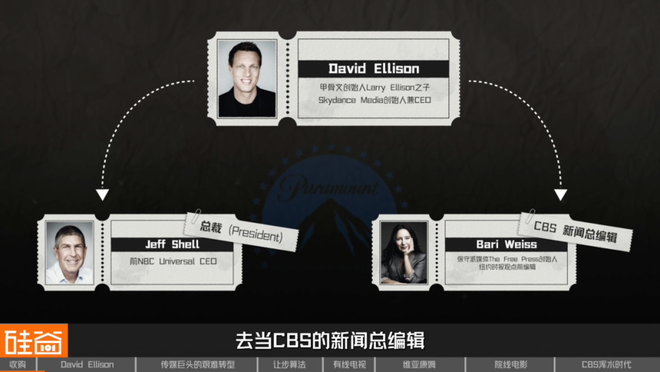 他还一口气换掉了大半批高层,找来前NBCUniversal的CEO Jeff Shell做总裁(President),还请了右倾媒体The Free Press的创始人Bari Weiss去当CBS的新闻总编辑。