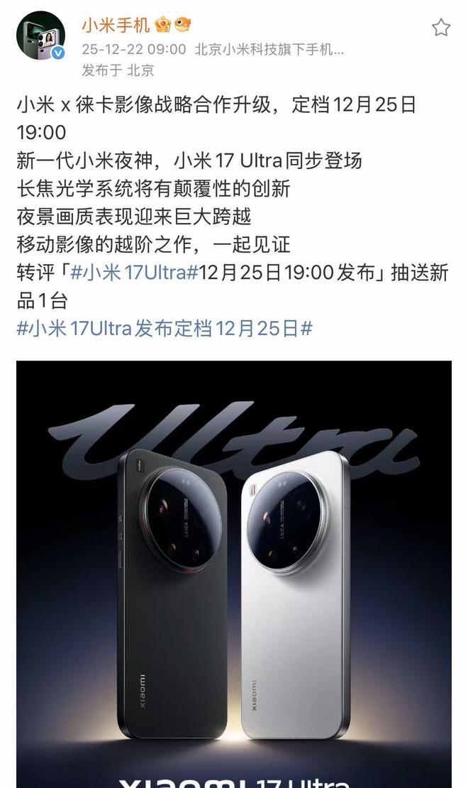 12月22日,小米宣布小米17 Ultra将于12月25日正式发布。