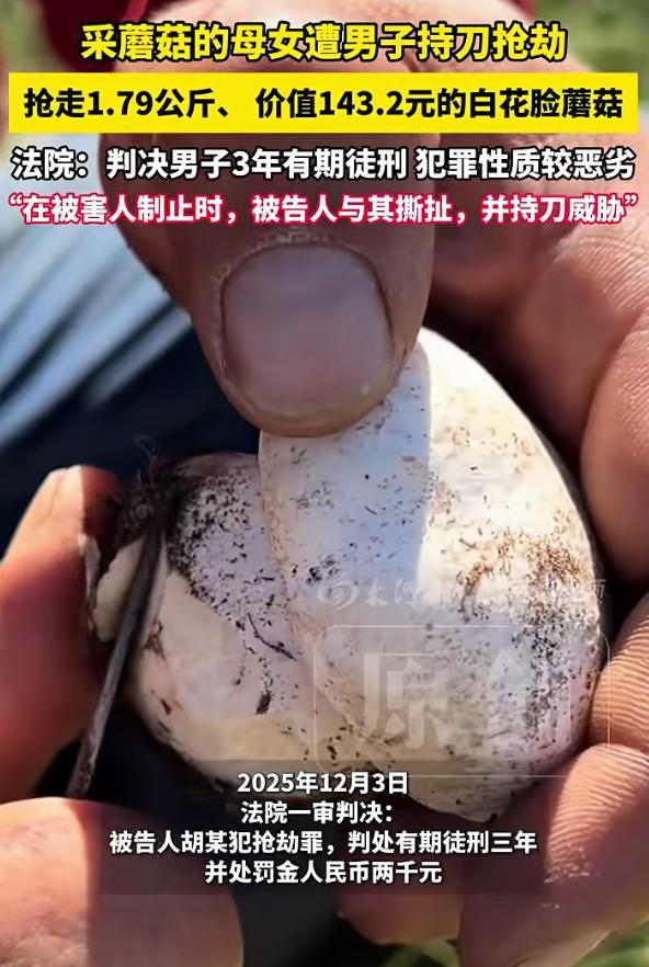 母女采蘑菇遭抢劫,白花脸蘑菇被夺,男子获刑三年
