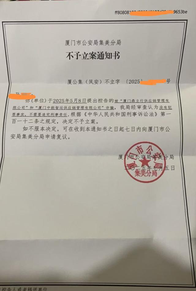 无奈之下,孙女士向警方报案,厦门市公安局集美分局出具《不予立案通知书》显示:你(单位)于2025年5月8日提出控告的被“厦门鼎立行供应链管理有限公司”和“厦门中能智运供应链管理有限公司”诈骗,我局经审查认为没有犯罪事实,不需要追究刑事责任,根据《刑事诉讼法》第一百一十二条之规定,决定不予立案。落款时间2025年7月5日。