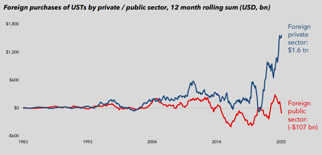 这并不难理解。政府购买美国国债是做战略外汇储备,而家庭和企业则看重的是近年来飙升的美国利率。State Street的研究认为,这些短期的、“价格敏感型买家”已经占据主导地位。那么,一旦美联储再次降息,他们大概率也将作鸟兽散。