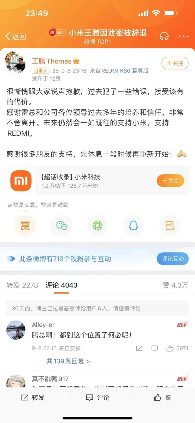 小米王腾泄密遭处罚,雷军忍痛挥刀斩爱将
