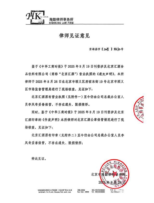 8月28日,澎湃新闻从接近北京汇源人士处获悉,海勤律师事务所在8月26日已经出具“律师见证意见”,对北京汇源的公章保管情况进行了现场核查,北京汇源原有印章至今仍由公司总裁办公室人员妥善保管,不存在丢失、毁损情形。