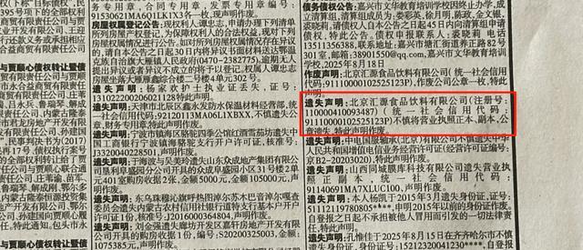 8月19日,《中华工商时报》刊登了一则《遗失声明》,称北京汇源食品饮料有限公司不慎将营业执照正本、副本,公章遗失,特此声明作废。据了解,该《遗失声明》由汇源的大股东方所刊登。