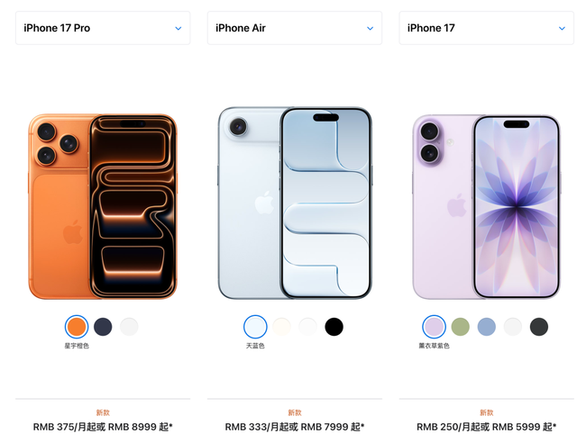 至于价格,iPhone 17 Pro的256GB版本为8999元起,iPhone 17 Pro Max同等容量则是9999元起,后者还提供了更大的2TB版本,价格直接来到了17999元。